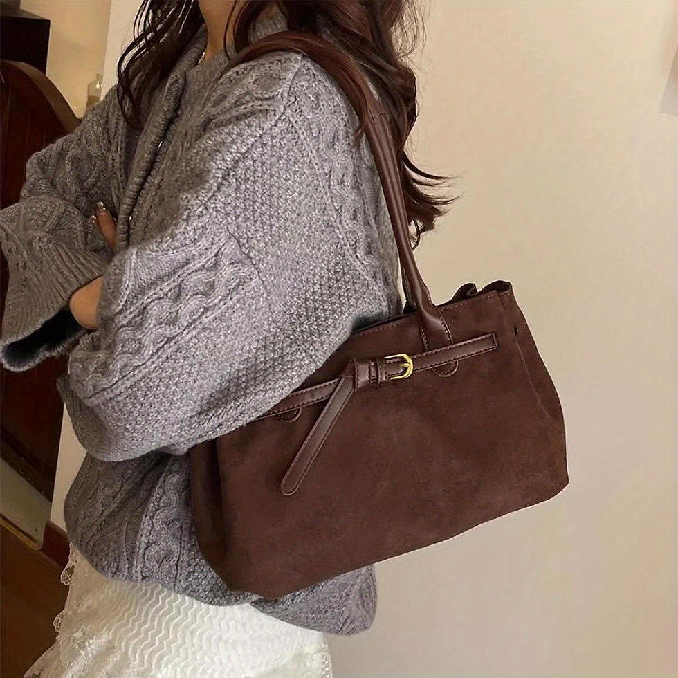 Retro Suede Tote Bag Large Capacity Shoulder Bag Trendy Metal Buckle Strap